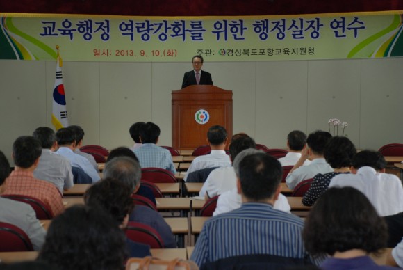 |  | | | ⓒ 영남매일신문 / 영남도민일보 | | 경상북도포항교육지원청(교육장 이경희)은 2013.09.10.(화) 경상북도포항교육지원청 대회의실에서 공립단설유치원, 공.사립 초,중,고,특수학교에 근무하는 행정실장 약 130여명을 대상으로 정부3.0추진과제 홍보 및 청렴도향상을 위한 행정실장 연수회를 개최하였다.