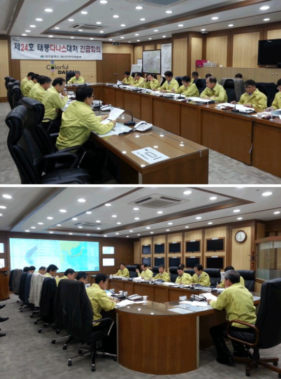대구시는 제24호 태풍 “다나스”가 북상하는데 따른 대응대책 마련을 위해 10. 7(월) 11시 건설방재국장 주관으로 구․군 도시(건설)국장이 참석한 가운데 태풍 다나스 대처 긴급회의를 개최하고 대구시와 구군이 비상근무체제에 돌입하여 24시간 상황을 유지하면서 태풍에 총력 대응키로 하였다.