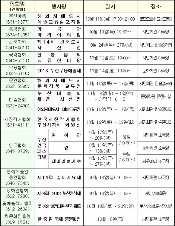 10.10.~10.27.(18일간) 부산시민회관, 부산문화회관, 부산예술회관 등에서 문화․예술 공연, 작품 전시, 심포지엄, 실버가요제 등 지역 문화․예술계가 마련한 다양한 행사가 진행되는‘2013 부산예술제’열려 직할시 승격 50주년을 기념해서‘시민참여 문화예술, 행복한 부산’을 슬로건으로‘가곡과 아리아의 밤’개막공연을 시작으로 상하이․시모노세키․후쿠오카 등 자매도시와 함께하는 국제교류 예술제로 진행