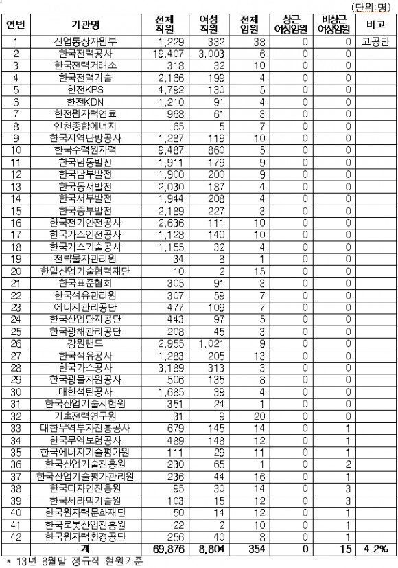산업부를 포함한 42개 기관의 전체 직원은 69,876명으로 이 중 여성은 8,804명으로 12.6%를 차지하지만, 전체 임원 354명 중 여성 상근임원은 한명도 없는 것으로 나타났으며, 비상근 여성임원은 15명으로 전체 임원중에서 겨우 4.2%를 차지하는데 그쳤다.