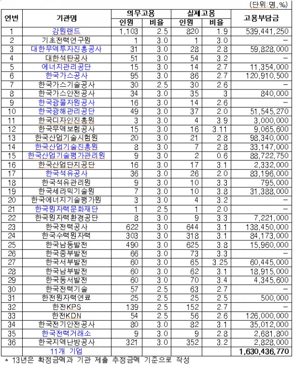 의무고용률을 채우지 못해 2008년 이 후 올해까지 납부한 고용부담금은 16억3천만원으로, ▲강원랜드가 5억3천9백만원, ▲한국전력공사가 1억3천8백만원, ▲한전KDN 1억2천6백만원, ▲한국가스공사 1억2천만원 순으로 나타났다.