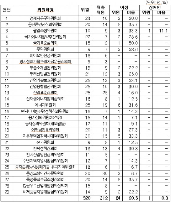 - 산업부위원회 여성위원 비율 20.5%..정부 평균 25.5%에 못 미쳐