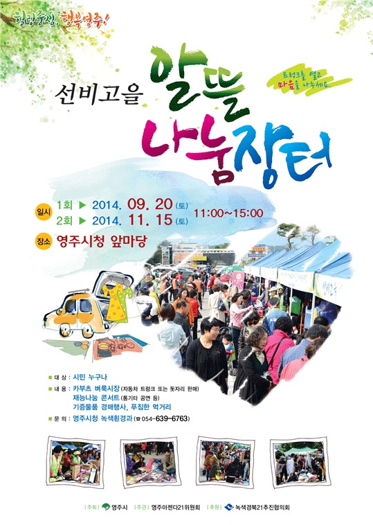 영주시와 영주아젠다21위원회(위원장 서익제)는 녹색생활 실천과 함께 자원재활용을 통한 건전한 소비문화와 나눔문화 정착을 위해 오는 20일 11시부터 오후 3시까지 영주시청 앞마당에서 「선비고을 알뜰 나눔장터」를 개최한다
