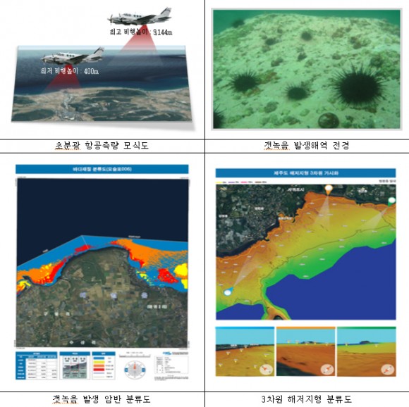 이와 관련하여 최첨단 기술인 초분광 항공영상 촬영은 항공기에 공간해상도가 1m이상의 초분광 센서를 장착하여 중고도에서 초정밀 영상을 촬영하는 것으로 갯녹음 발생해역과 해조류 서식해역을 분리 측정할 수 있는 장비이다. 또한 항공레이저 수심측량을 통하여 매우 정밀하게 갯녹음 발생해역의 수심대를 파악하고, 그 결과로 해저의 암반면적 및 갯녹음 면적을 산정하게 된다.