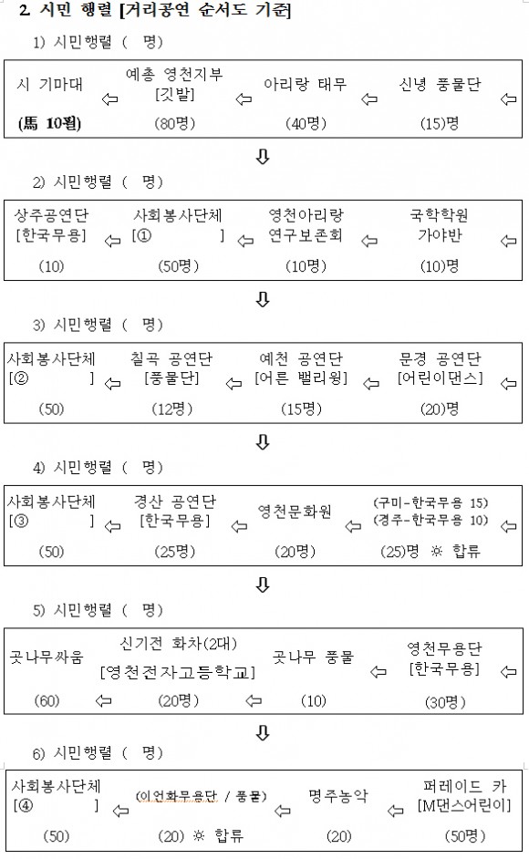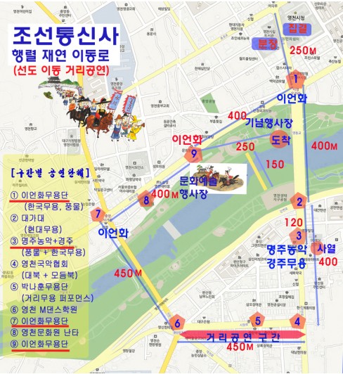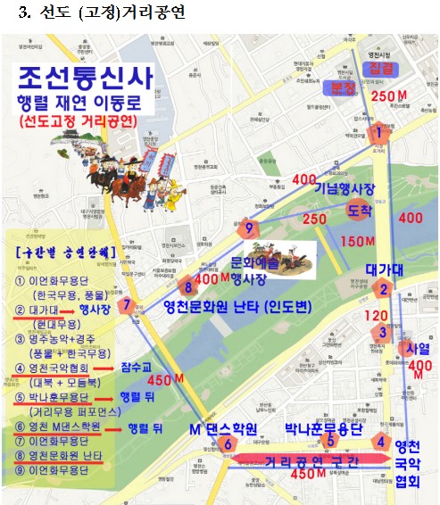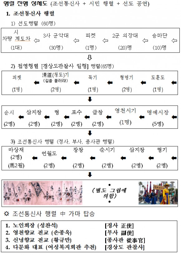 주제행사인 조선통신사 행렬 복원, 재연은 제2작전사령부의 전폭적인 후원으로 200여명의 장병들이 조선시대 문․무관 등 복식을 입고 10월 2일 오후 3시부터 영천시청을 출발, 영천시장, 국민은행오거리, 남문오거리를 거쳐 축제가 열리는 영천금호강변공원까지 2.5㎞의 행렬을 재연하는 가운데 곳곳마다 조선통신사와 관련이 있는 8개 연고도시(문경시, 예천군, 안동시, 영천시, 경주시, 경산시, 칠곡군, 구미시, 상주시) 예술공연단이 거리공연을 펼치며 영천전자고등학교와 영천시 청년연합회, 영천문화원이 함께 펼치는 곳나무싸움 줄다리기 등도 선보이게 된다.