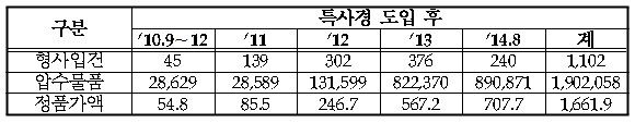 특사경이 본격적으로 도입된 2011년과 비교하여 2013년의 단속실적은 형사입건자는 3배, 압수물품은 29배, 정품가액으로는 7배 가량 증가하였는데, 2014년 8월까지의 단속실적은 작년 실적을 훌쩍 넘어서 짝퉁으로 인한 소비자 피해가 우려되는 상황이다.
