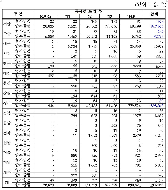 |  | | | ↑↑ <최근 5년간 지역별(시도별) 압수물품 현황 및 형사입건 현황> | | ⓒ (주)영남도민일보 | |