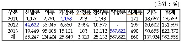 2011년부터 2013년까지 단속결과 수량기준으로 최대 압수물품 품목은 비아그라와 시알리스 같은 의약품류가 가장 많았으며, 샤넬과 루이비똥의 의류와 뉴발란스와 나이키 등의 신발류 순으로 나타났으며, 2011년에는 신발류가, 2012년에는 가방류, 2013년에는 의약품류 단속수량이 최대인 걸로 분석됐다.