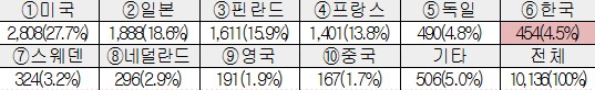 ※ 국제표준화기관인 ISO, IEC, ITU에 선언된 표준특허 현황을 보면 올해 6월 기준, 보유 표준특허 454건(전 세계의 4.5%)