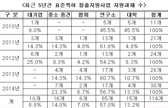 - 아울러 표준특허 선언에서도 연구소(47건)→대학(16건)→중소·중견(9건)→협회(0건)으로 나타나 지원에 대비해 실적이 나타났음