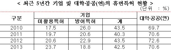 - 특허등록비율을 보면, 대학의 경우 2010년 41.1%에서 2013년 71.9%로, 공공연구소의 경우 2010년 36.4%에서 2013년 74.4%까지 급증함