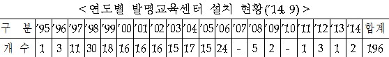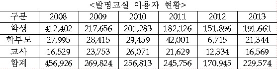 - 하지만 2002년 이후 설립된 발명교실은 지속적으로 노후화가 진행되고 있음에도 불구하고 현대화 사업이 ’10년 이후 중단되었음