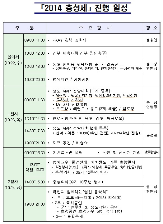 육군3사관학교는 10월 22일부터 24일까지 3일간 학교 교정에서 개교 46주년을 자축하고 사관생도들의 열정과 패기, 신선한 감동을 느낄 수 있는「2014 충성제」를 개최한다.