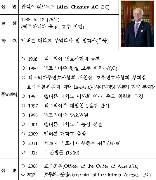 10. 21.~10. 23. 부산시-빅토리아주 자매도시결연 20주년을 기념하고 월드IT쇼에 참가하는 빅토리아주 ICT 26개 기업을 격려하기 위해 알렉스 췌르노프 (Alex Chernov AC QC) 빅토리아주 총독 부산 방문