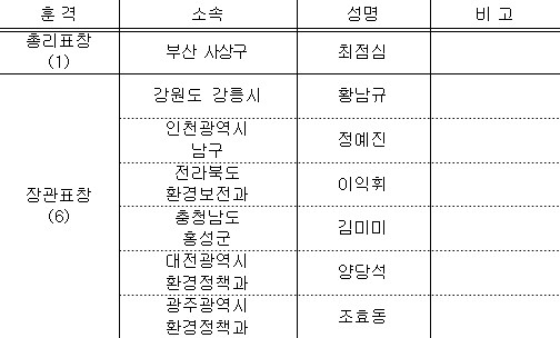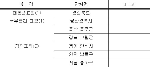 한편, 올해의 환경관리 평가에서 광역단체 ‘도’는 경상북도가 대통령 표창을, 광역단체 ‘특․광역시’는 울산광역시가 국무총리 표창을, 기초단체는 울주군을 비롯하여 경북 고령군, 경기 안성시, 인천 남동구, 서울 송파구가 환경부장관 표창을 수상한다.