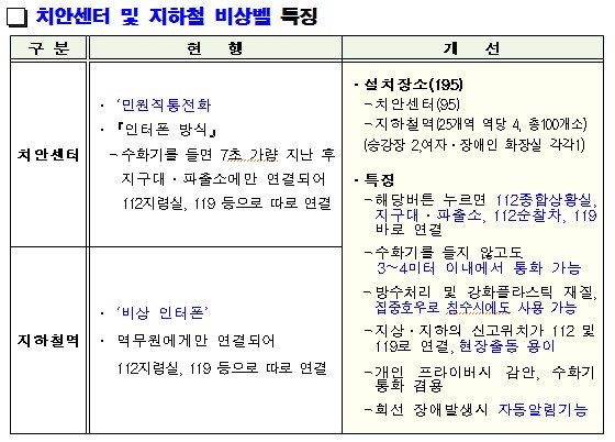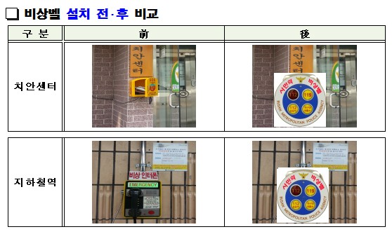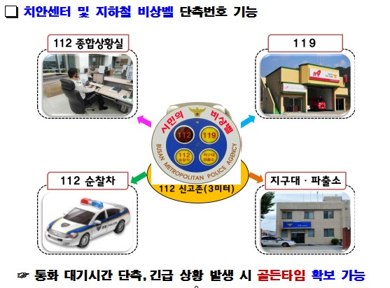 부산광역시(시장 서병수)와 부산지방경찰청(청장 이금형)에서는 지하철은 화재 등 각종 사건사고 발생 시 역무원과 연락할 수 있는 ‘비상인터폰’외에는 외부와 연락할 수 있는 긴급 통신수단이 없어 치안센터는 근무시간이 종료된 야간에 지구대나 파출소로만 연결되는 ‘민원직통전화’만으로는 위급 상황 시 즉시 경찰이나 소방의 도움을 받을 수 없다는 점을 착안하여『112종합상황실, 지구대․파출소, 112순찰차, 119』에 바로 연결되는 ‘비상벨’을 전국 최초로 개발 ,설치하여 부산시내 95개소 치안센터는 물론 부산교통공사측과 협의, 지하철 25개역 등 100개소를 포함, 총 200여 개소 설치․운용에 들어간다.