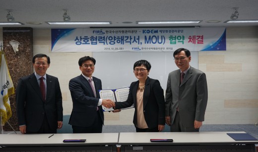 |  | | | ⓒ (주)영남도민일보 | | 한국수산자원관리공단(FIRA, 이사장 강영실)과 해양환경관리공단(KOEM, 이사장 곽인섭)은 수산자원조성관리 및 해양생태환경 분야 상호교류와 협력증진의 기반을 마련하고자 2014년 10월 28일, FIRA 회의실에서 업무협약을 체결했다.