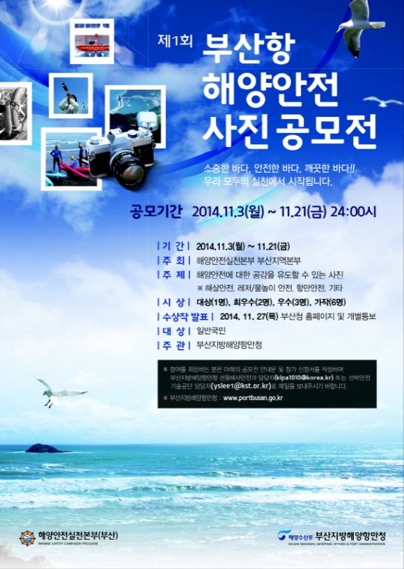 부산지방해양항만청(서병규 청장)은 해양안전실천본부 부산지역본부의 대국민 해양안전문화 조기정착 활동의 일환으로「제1회 부산항 해양안전 사진 공모전」을 11월 3일부터 11월 21일까지 개최한다.