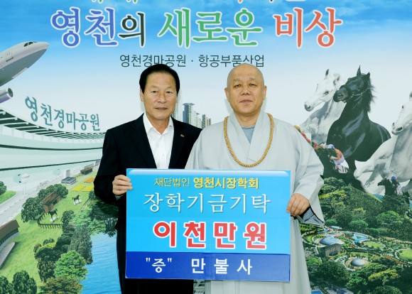 지난 7일 영천시장학회(이사장 김영석)에 영천 만불사(주지 학성스님)에서 2,000만원, 중앙로타리클럽 회원인 조두호씨가 100만원의 장학금을 기탁했다. |  | | | ⓒ (주)영남도민일보 | |