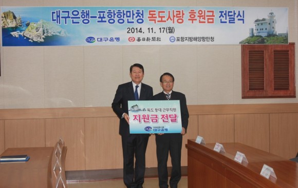 포항지방해양항만청(청장 공평식)은 독도사랑을 지속적으로 펼쳐온 대구은행(행장 박인규)과 함께 독도등대 직원후생 복지기금 전달식을 17일 포항항만청에서 가졌다.
