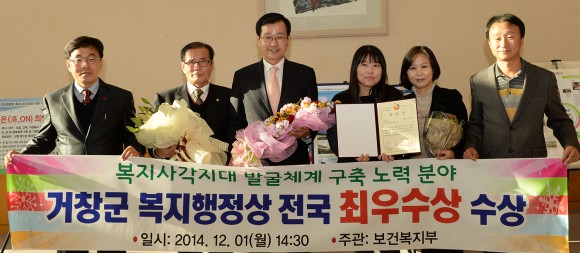거창군은 지난 1일 부산시청 국제회의장에서 보건복지부 2014년도 복지행정상 시상식에서 ‘복지사각지대 발굴 체계 구축 노력’ 부문 전국 최우수 표창과 포상금 3천만 원을 받아 복지 거창의 위상을 높였다.