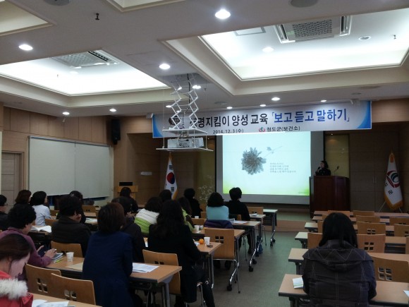 |  | | | ⓒ (주)영남도민일보 | | 청도군(군수 이승율)은 12월 3일 청도군보건소 대회의실에서 하나병원 정신보건전문요원을 초빙하여 보건소공무원, 지역사회통합 건강증진전문인력, 아동통합서비스전문요원 등 30여 명을 대상으로 생명지킴이 양성교육 ‘보고 듣고 말하기’를 실시했다.