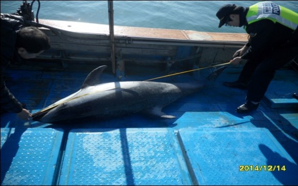 울산해양경비안전서(서장 김종욱)는 14일 오전 8시경 울주군 서생면 간절곶 동방 18km 해상에서 자망그물에 돌고래 1마리가 혼획 되었다고 밝혔다.