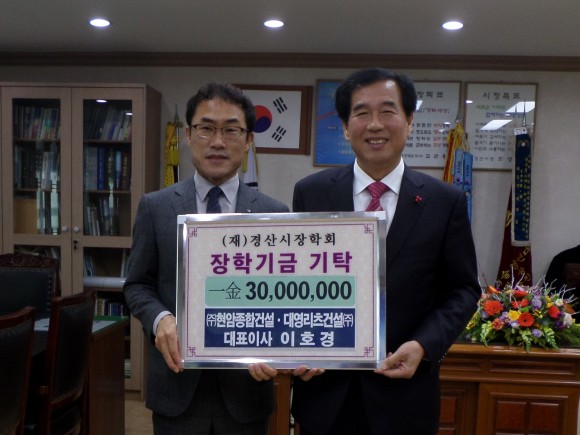 ㈜현암종합건설 이호경 대표이사는 23일 (재)경산시장학회를 방문해 지역 인재양성을 위해 써 달라며 3,000만원의 장학금을 기탁했다.