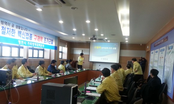 이날 긴급회의에는 김영석 영천시장, 경상북도 주낙영 행정부지사와 농림축산검역본부, 경상북도 축산경영과장, 군부대, 경찰서, 축협 등 유관기관 관계자들이 참석한 가운데 긴급방역을 위하여 구제역 긴급행동지침(SOP)에 따라 기관별 역할분담에 따른 임무 및 조치사항을 긴급 논의하였다.