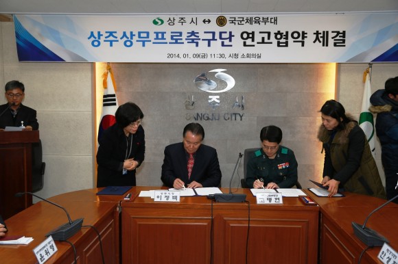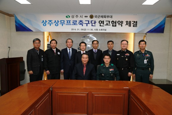 |  | | | ⓒ (주)영남도민일보 | | 상주상무프로축구단의 연고협약이 2014년 12월 31일자로 만료됨에 따라 상주시(시장 이정백)와 국군체육부대(부대장 고명현)는 1월 9일 시청 소회의실에서 상주상무프로축구단의 연고협약을 연장하기 위한 계약을 체결함으로써 앞으로 2년간 상주의 명예를 걸고 활동하게 된다.