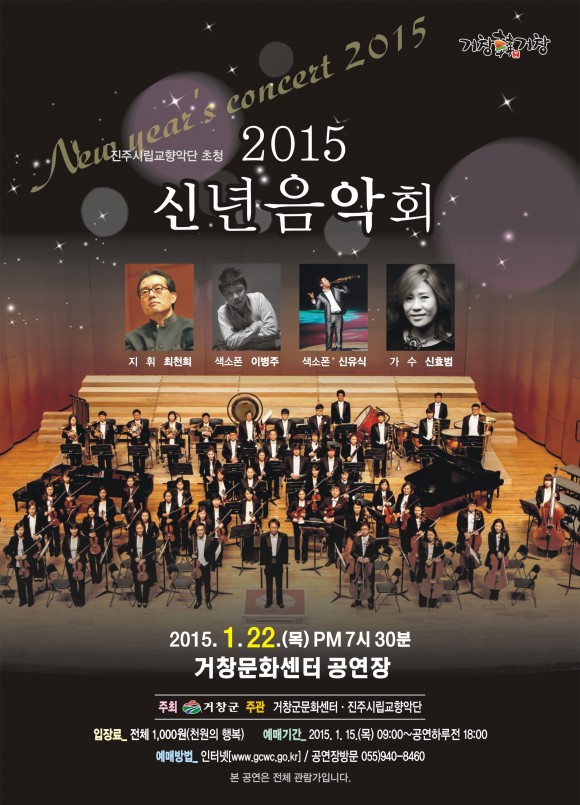 거창군(문화센터)에서는 을미년인 2015년을 화합하고 소통하는 한해로 시작하고자 신년음악회를 준비했다. 1월 22일(목) 19시30분에 개최되는 ‘2015 신년음악회’는 서부경남을 대표하는 진주시립교향악단을 초청해 군민들과 방학을 맞아 한창 즐거운 시간을 보내고 있는 학생들을 위해 함께 즐길 수 있는 프로그램으로 준비했다.