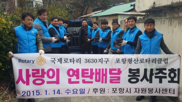 |  | | | ⓒ (주)영남도민일보 | | 국제로타리클럽3630지구 포항형산로타리클럽(회장,김진태)에서는 2015년1월14일 포항시,독거노인 가정과 저소득층 가정에 연탄 3,000장을 전달했다.