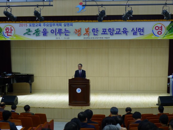 |  | | | ⓒ (주)영남도민일보 | | 경상북도포항교육지원청(교육장 이경희)은 2015년 1월 23일(금) 10시 포항교육지원청 여울관에서 관내 공사립유치원장, 초중학교 교장선생님 150여명을 대상으로 2015 큰 꿈을 이루는 행복한 포항교육의 새로운 비전과 시책을 발표하였다.