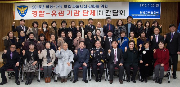 경북경찰청(청장 김치원) 은 1월 23일 경북지방경찰청 5층 대회의실에서 그동안 성․가정폭력 예방 및 여성․아동 피해자 보호에 앞장서 활동한 지역사회 유관기관․단체에 대한 격려의 장을 마련하고 상호 격의 없는 소통으로 이해의 폭을 넓히기 위해 ‘2015년 여성․아동 보호 파트너십 강화를 위한 경찰-유관 기관․단체 간 간담회’를 개최하였다