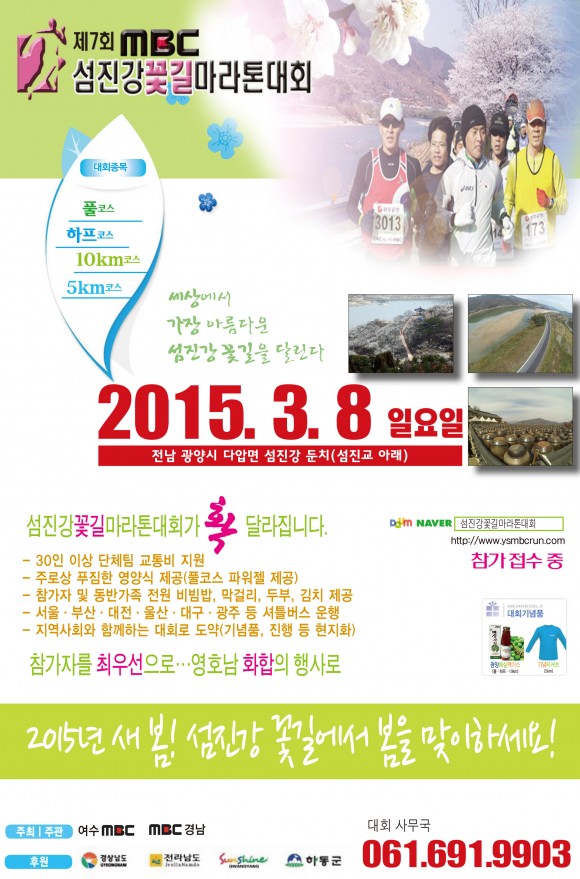 영호남 화합 축제이자 대한민국의 봄을 여는 대표적 체육행사인 ‘제7회 MBC 섬진강 꽃길 마라톤 대회’가 오는 3월 8일 매화꽃 향기 그윽한 섬진강 매화마을 일원에서 열린다.