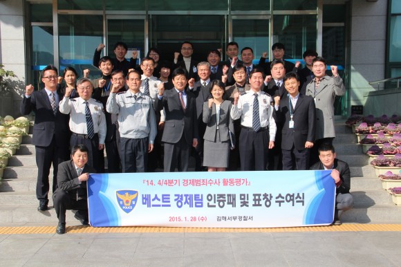 김해서부경찰서(서장 김한수)는 1월 28일(수), 경찰서 2층 회의실에서 서장, 수사과장, 경제팀장 등 31명이 참석한 가운데 경남지방경찰청 김수희 제2부장이 방문하여 ‘14년 4/4분기 베스트 경제팀 인증패 및 표창 수여식’을 개최하였다.