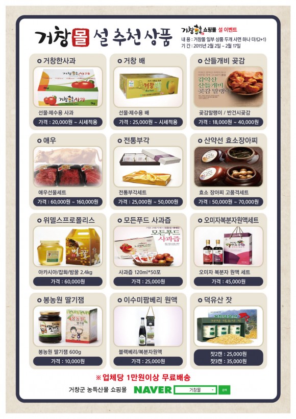 오는 2월 2일부터 시작하는 거창몰 설맞이 이벤트는 일부 품목을 2개 구매 시 1개를 추가로 드리는 ‘2+1 이벤트’, 이벤트 기간 동안 출석 시 5,000원 적립금을 드리는 ‘출석체크 이벤트’, 카카오스토리에서 친구 맺기(ID:gcgcmall)로 가입한 회원을 대상으로 50명을 추첨해 거창몰 상품 중 1개를 보내드리는 ‘카카오스토리 추첨 이벤트’ 등 내용이 풍성하고 다양하다.