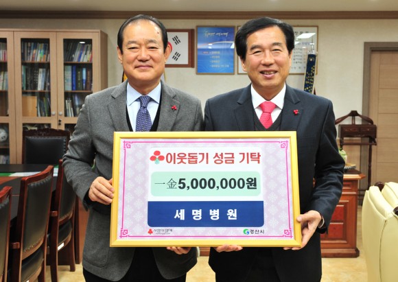 서명의료재단 세명병원(이사장 최영욱)이 관내 어려운 이웃들에게 조금이나마 도움이 되길 희망한다며 29일 경산시청을 방문해 ‘희망 2015 나눔 캠페인’ 이웃돕기 성금 500만원을 기탁했다.