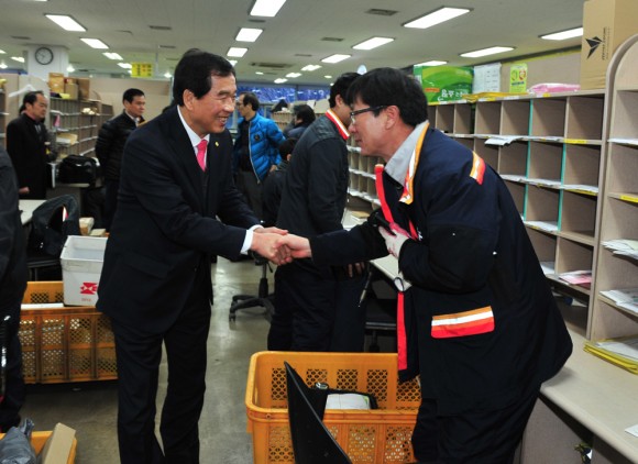 최영조 경산시장은 9일 경산우체국을 찾아 민족 최대 명절인 설을 앞두고 밀려드는 택배와 우편물 배달 등 최일선에서 노고가 많은 집배원들을 격려했다.