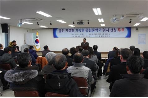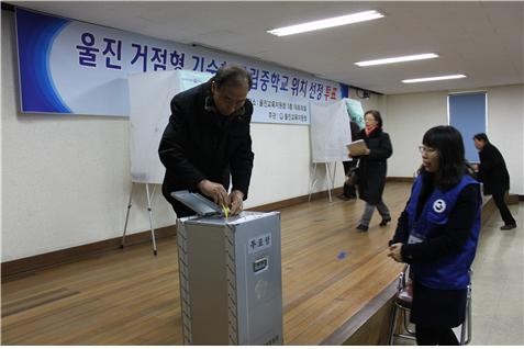 3개 지역별 대표 각 10명과 외부 투표인단 14명(울진 관내 초·중학교 교장)의 44명 투표인단 전원이 참가한 이번 투표에서 온정면은 결선 투표까지 가는 접전 끝에 울진 기숙형중학교 설립지로 최종 결정되었다.
