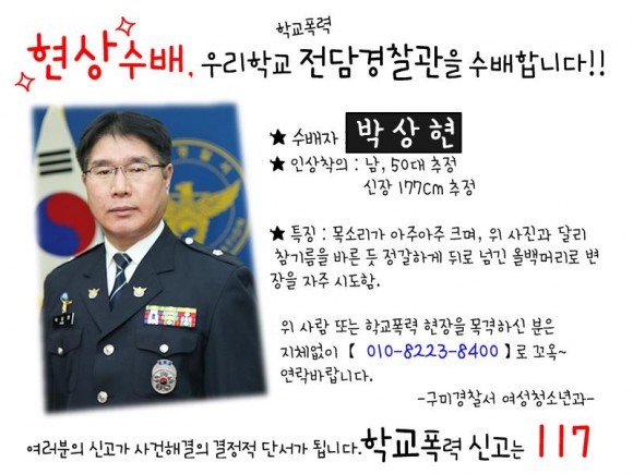 기존의 판에 박힌 홍보물이 아니라 현상수배라는 붉은 글씨의 타이틀로 시작되는 홍보물은 수배자 박상현(담당경찰관 이름임) 특징 목소리가 아주 크며, 참기름을 바른 듯 정갈하게 뒤로 넘긴 올백머리로 변장을 자주함 등으로 작성되어 있어 읽는 학생들마다 폭소를 자아내고 있다.