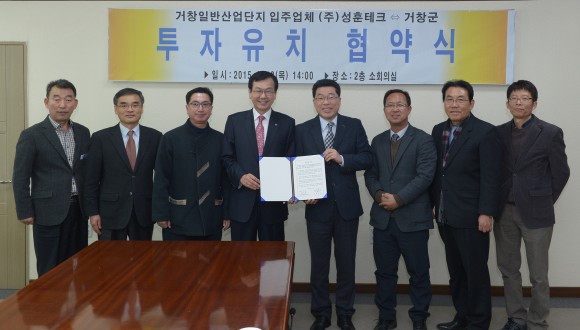 이번 협약은 (주)성훈테크가 거창일반산업단지 내에 투자결정을 함에 따라, 상호간에 상생발전 및 지역경제 활성화를 위해 체결됐다. |  | | | ⓒ (주)영남도민일보 | | 거창일반산업단지 내 남상면 대산리 1596 등 2필지에 입주예정인 (주)성훈테크는 파형강관을 생산하는 업체로 이번 협약을 통해 2015년 7월까지 총 60억 원을 투자하고 지역주민 우선고용 등을 통해 지역경제 활성화에 이바지할 것으로 예상된다. 이홍기 거창군수는 불경기에도 불구하고, (주)성훈테크의 대규모 투자결정을 환영하고, 추후 사업을 영위함에 있어 이번 투자결정이 후회되지 않도록 행정상 지원을 세심히 챙기겠다고 하며, 지역경제 발전에 견인차 역할을 해 줄 것을 당부했다. 김득철 (주)성훈테크 대표는 앞으로 공장설립이 완료되면 거창지역 주민을 우선적으로 고용함은 물론, 생산품 유통도 관내 업체를 주로 이용하여 미약하나마 거창발전에 도움이 되었으면 하는 소망을 밝혔다.