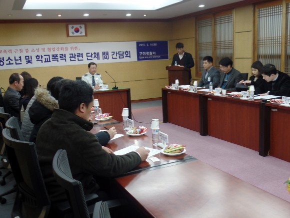 구미경찰서(서장 이준식)에서는 지난 10일 15시께 경찰서 2층 송정마루에서 교육청, 청소년상담복지센터, Wee센터, 청소년 행복세상, 청소년 수련원, 동북아청소년협의회, 파로스 대안학교 관계자 등 15명이 참석한 가운데 민․관 합동「학교폭력 피해자 통합 지원팀」구성을 위한 간담회를 개최했다.