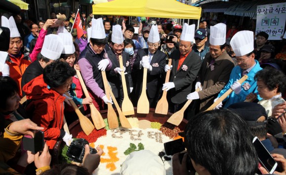 개막행사 참가자들은 자리를 읍내장터로 옮겨 대장간 현판식을 갖고 이어 시장 중앙통로 간이공연장에 마련된 대형 비빔밥 용기에 갖은 봄나물을 넣어 비비는 비비밤 퍼포먼스를 하며 너와 내가 하나 됨을 알렸다.