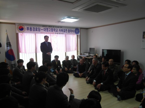 대영고등학교(교장 이지흠) 그루터기 봉사동아리는 지난 3월 26일 영주1동 부용경로당(노인회장 정진흠)을 찾아 자매결연을 맺고 학생들이 경로효친을 실질적으로 체험하여 어른을 공경 하고 긍정적인 사고로 주변을 살피는 정서순화 및 인성교육 실천의 장을 마련하고 급속한 노령인구 증가로 지역에 홀로 살아가시는 어르신들의 외로움을 달래주고자 학생들과 세대간 소통의 장을 마련하는 자매결연 협약식을 가졌다.