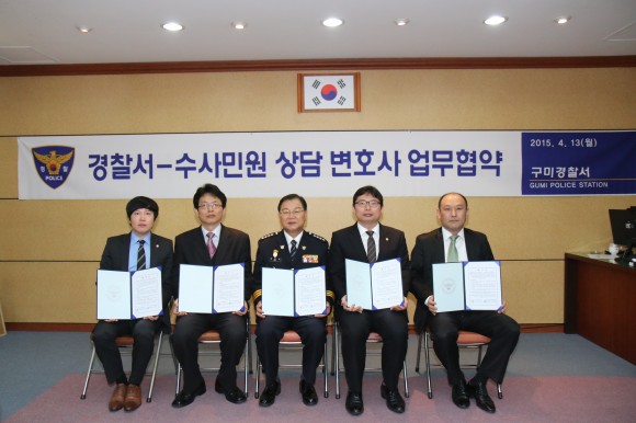 |  | | | ⓒ (주)영남도민일보 | | 구미경찰서(서장 이준식)는, 2015. 4. 13(월) 10:30경, 구미경찰서 2층 송정마루 회의실에서 대구지방변호사회 소속 변호사 4명과 상호 보유한 인적, 물적 자원을 교류 ․ 협력하여 민사사항의 형사고소 남발로 인한 폐단 예방과 민원인에 대한 전문화된 법률서비스를 제공함으로써 수사민원인의 만족도 제고를 위하여 업무협약을 체결하였다.