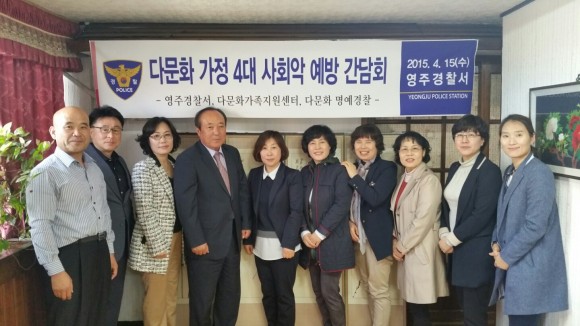 영주경찰서(서장 김한섭)는 2015. 4. 15(수) 다문화 명예경찰, 다문화가족지원센터장을 초청, 다문화 가정 청소년들의 학교폭력 예방 등 4대 사회악 예방을 위한 간담회를 개최하고, 다문화 명예경찰 역할의 중요성을 강조하였다.