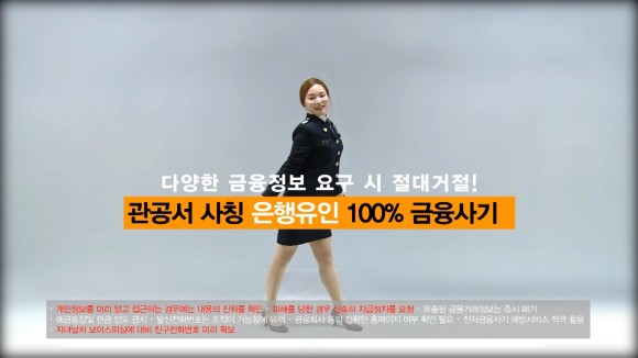 영상에서는‘관공서 사칭 은행유인 100% 금융사기’라는 문구를 삽입하여 관공서에서는 절대로 금융정보를 요구하지 않음을 국민들에게 알리고 있다.