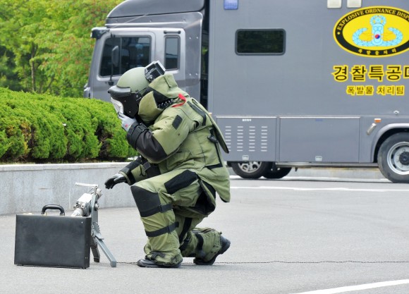 |  | | | ⓒ (주)영남도민일보 | | 대전 유성구 어은동 한국항공우주연구원에서 최근열린 2015 안전한국훈련과 연계한 현장대응훈련 중 경찰 특공대가 폭발물 제거를 하고 있다.