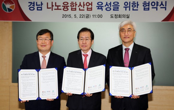 도는 최근 도청 도정회의실에서 홍준표 경남도지사, 박일호 밀양시장, 김흥남 한국전자통신연구원장이 참석한 가운데 ‘경남 나노융합산업 발전’과 ‘밀양 나노융합 국가산업단지 조성’의 원활한 추진을 위해 업무협약을 체결했다고 밝혔다.